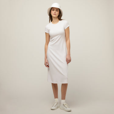 A refined take on casual dressing, the Short Sleeve Rib Tee Dress blends comfort with a sleek, elevated silhouette. Made from a soft, Tencel-cotton ribbed knit with a touch of stretch for all-day comfort, the midi length creates an elongated, polished look, while the rib texture enhances flexibility and shape retention. Designed with a fitted shape, regular shoulder, midi length, and short sleeves, it transitions effortlessly from active adventure to easy lounging.