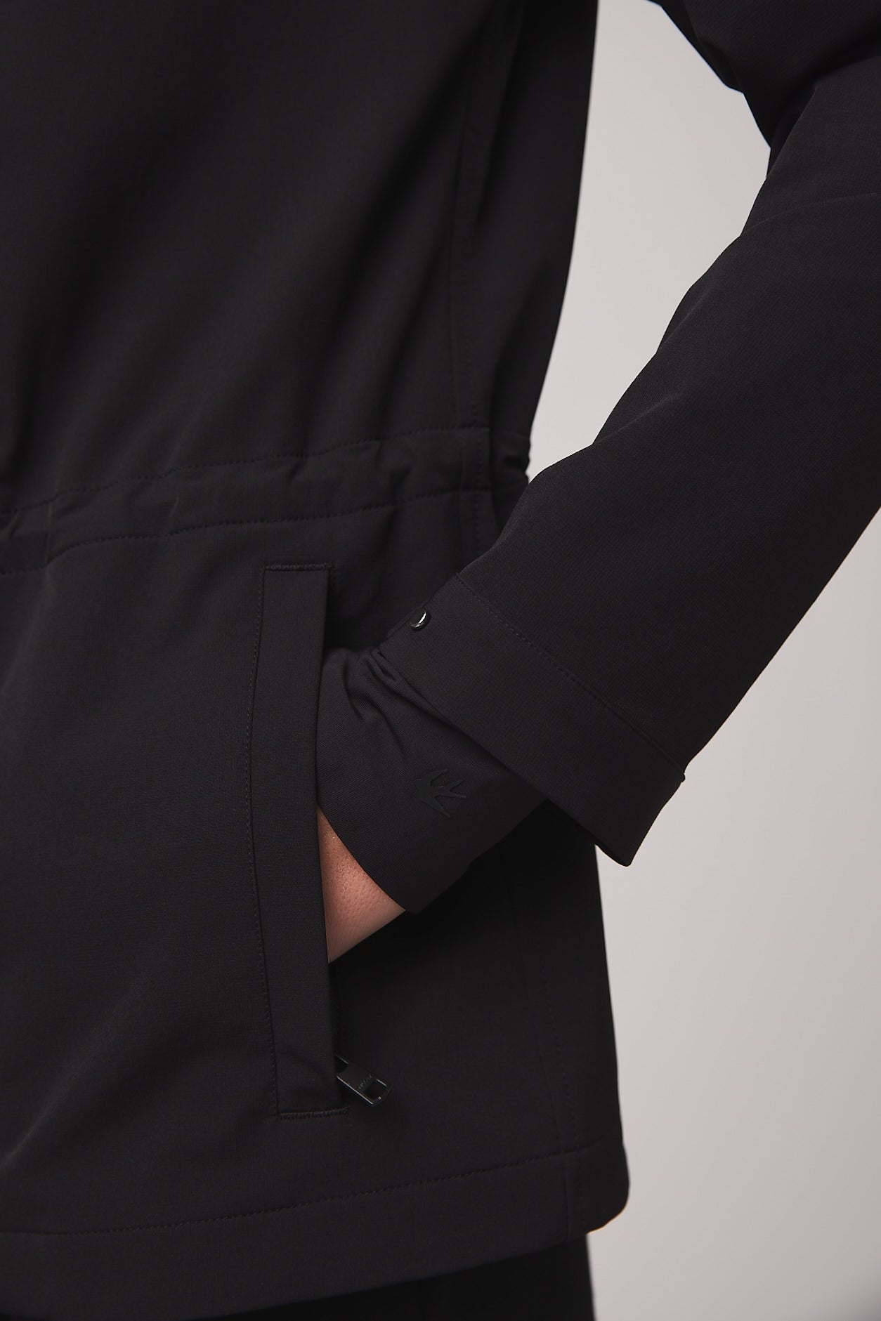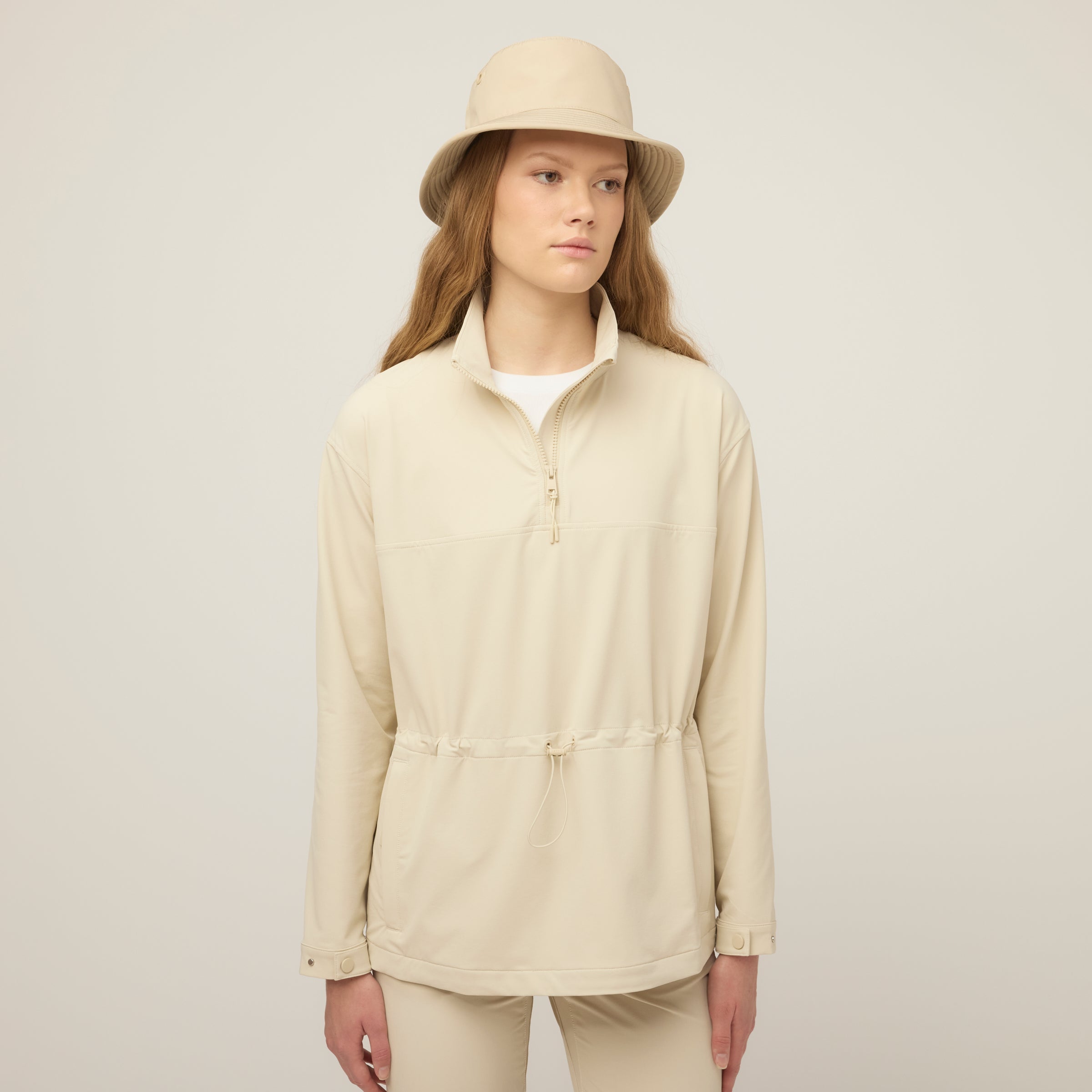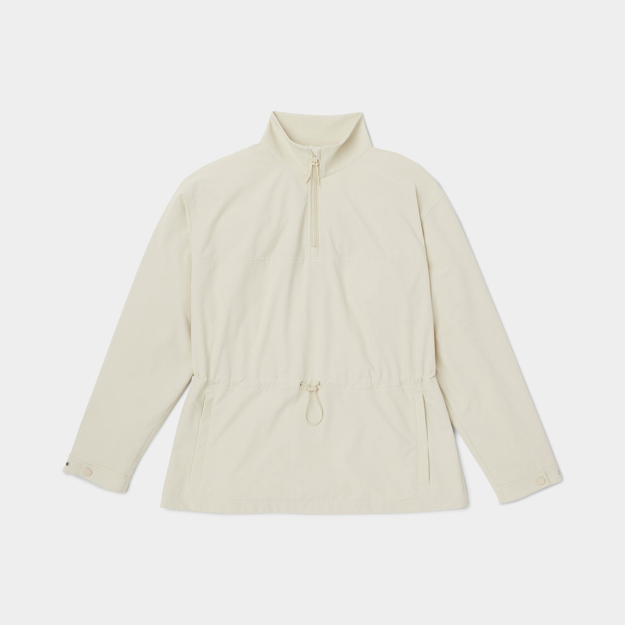 Double weave fabric gives this anorak extraordinary durability and resistance to both wind and water without compromising essential comfort. Four way stretch accommodates a full range of movement while the bungee waist can be adjusted for a more fitted or relaxed silhouette. The high neck collar keeps the wind out and can offer additional ventilation when unzipped.